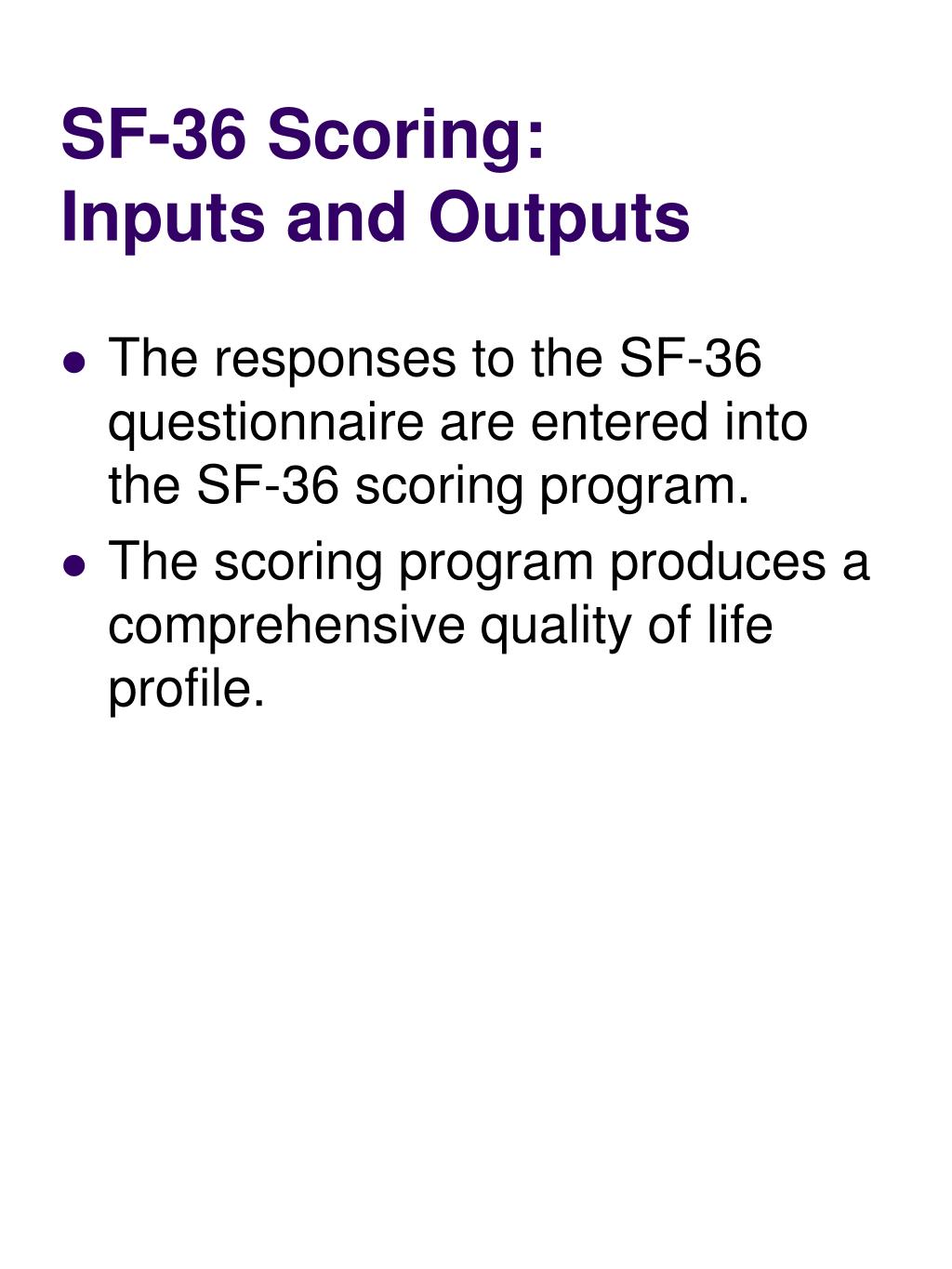 SF-36 Scoring:Inputs and Outputs • The responses to the SF-36 questionnaire are entered into the SF-36 scoring program. • The scoring program produces a comprehensive quality of life profile.