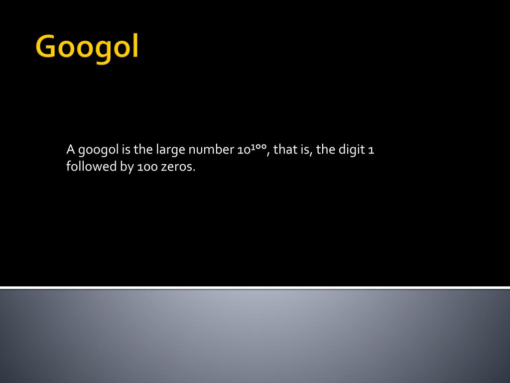 A googol is the large number 10¹°°, that is, the digit 1 followed by 100 zeros. Googol
