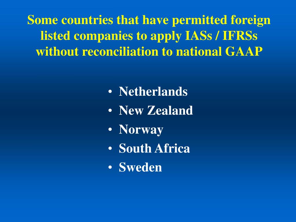 Some countries that have permitted foreign listed companies to apply IASs / IFRSs without reconciliation to national GAAP • Netherlands • New Zealand • Norway • South Africa • Sweden