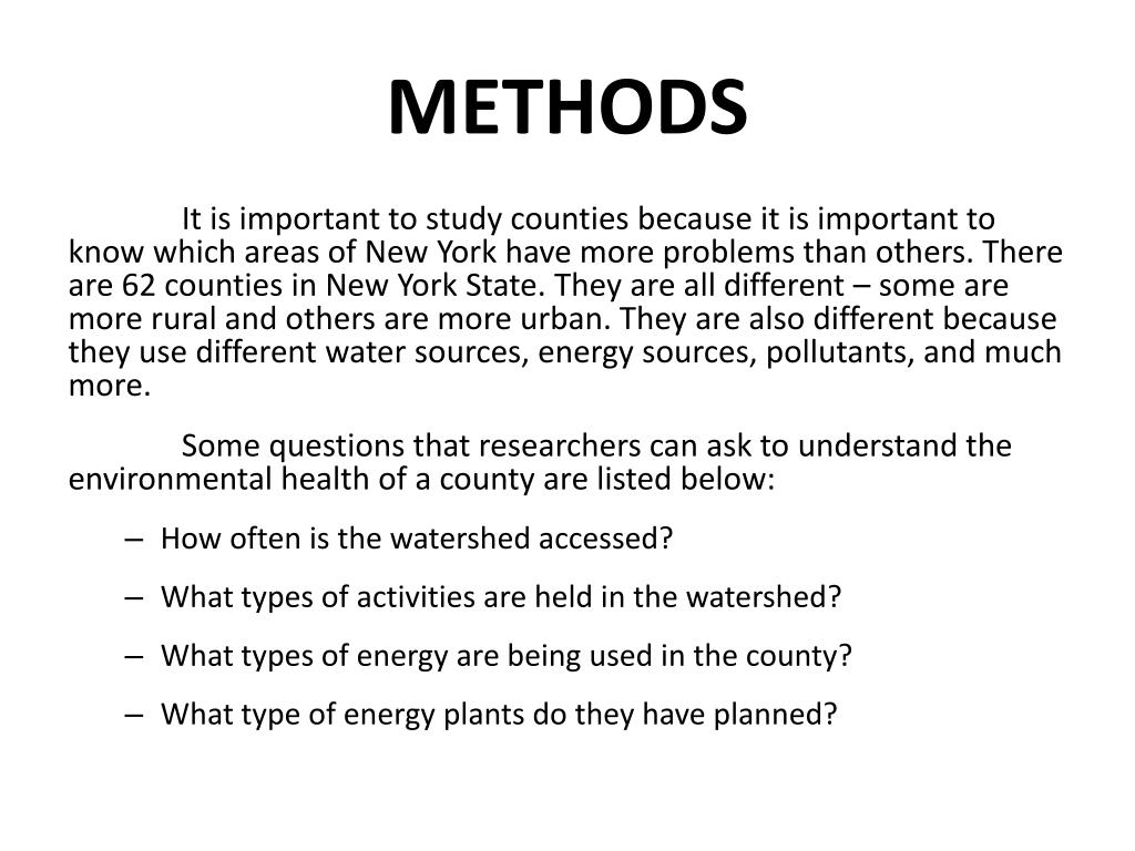 METHODS It is important to study counties because it is important to know which areas of New York have more problems than others. There are 62 counties in New York State. They are all different – some are more rural and others are more urban. They are also different because they use different water sources, energy sources, pollutants, and much more. Some questions that researchers can ask to understand the environmental health of a county are listed below: • How often is the watershed accessed? • What types of activities are held in the watershed? • What types of energy are being used in the county? • What type of energy plants do they have planned?