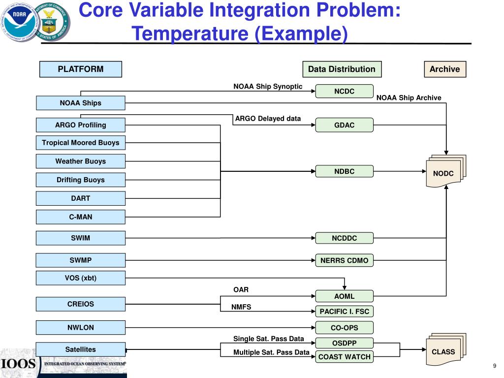 Core Variable Integration Problem: Temperature (Example) PLATFORM Data Distribution Archive NOAA Ship Synoptic NCDC NOAA Ship Archive NOAA Ships ARGO Delayed data GDAC ARGO Profiling Tropical Moored Buoys Weather Buoys NODC NDBC Drifting Buoys DART C-MAN SWIM NCDDC SWMP NERRS CDMO VOS (xbt) OAR AOML CREIOS NMFS PACIFIC I. FSC NWLON CO-OPS Single Sat. Pass Data CLASS OSDPP Satellites Multiple Sat. Pass Data COAST WATCH