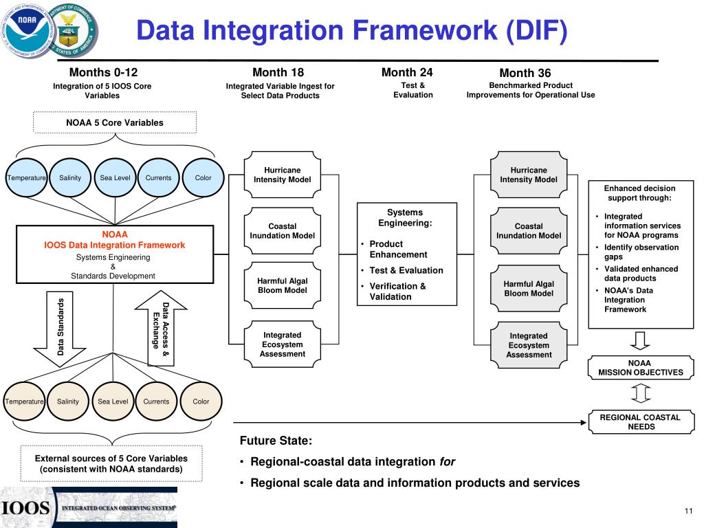 NOAAIOOS Data Integration Framework Systems Engineering & Standards Development Hurricane Intensity Model Temperature Salinity Sea Level Currents Color Coastal Inundation Model Harmful Algal Bloom Model Data Access & Exchange Data Standards Integrated Ecosystem Assessment Temperature Salinity Sea Level Currents Color External sources of 5 Core Variables (consistent with NOAA standards) Data Integration Framework (DIF) Months 0-12 Month 18 Month 24 Month 36 Test & Evaluation Benchmarked Product Improvements for Operational Use Integration of 5 IOOS Core Variables Integrated Variable Ingest for Select Data Products NOAA 5 Core Variables Hurricane Intensity Model • Integrated information services for NOAA programs • Identify observation gaps • Validated enhanced data products • NOAA’s Data Integration Framework Enhanced decision support through: • Product Enhancement • Test & Evaluation • Verification & Validation Systems Engineering: Coastal Inundation Model Harmful Algal Bloom Model Integrated Ecosystem Assessment NOAA MISSION OBJECTIVES REGIONAL COASTAL NEEDS • Future State: • Regional-coastal data integration for • Regional scale data and information products and services