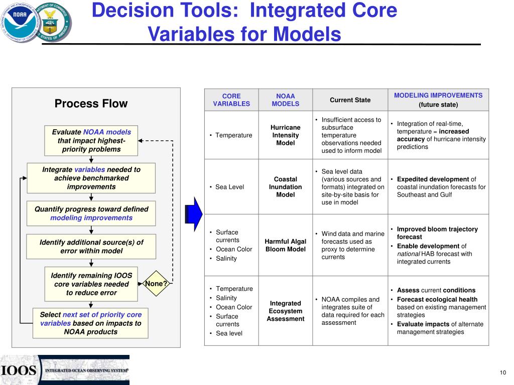 Decision Tools: Integrated Core Variables for Models Process Flow Evaluate NOAA modelsthat impact highest-priority problems Integrate variables needed to achieve benchmarked improvements Quantify progresstoward defined modeling improvements Identify additional source(s) of error within model Identify remaining IOOS core variablesneededto reduce error None? Selectnext set of priority core variablesbased on impacts to NOAA products