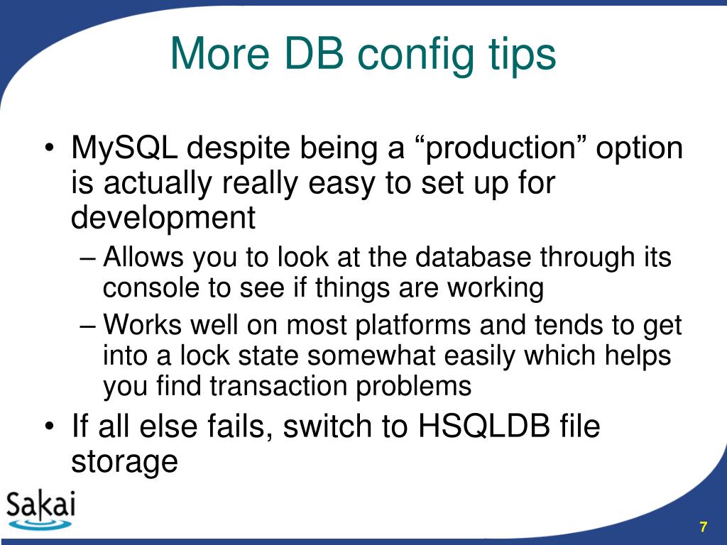 MySQL despite being a “production” option is actually really easy to set up for development Allows you to look at the database through its console to see if things are working Works well on most platforms and tends to get into a lock state somewhat easily which helps you find transaction problems If all else fails, switch to HSQLDB file storage More DB config tips