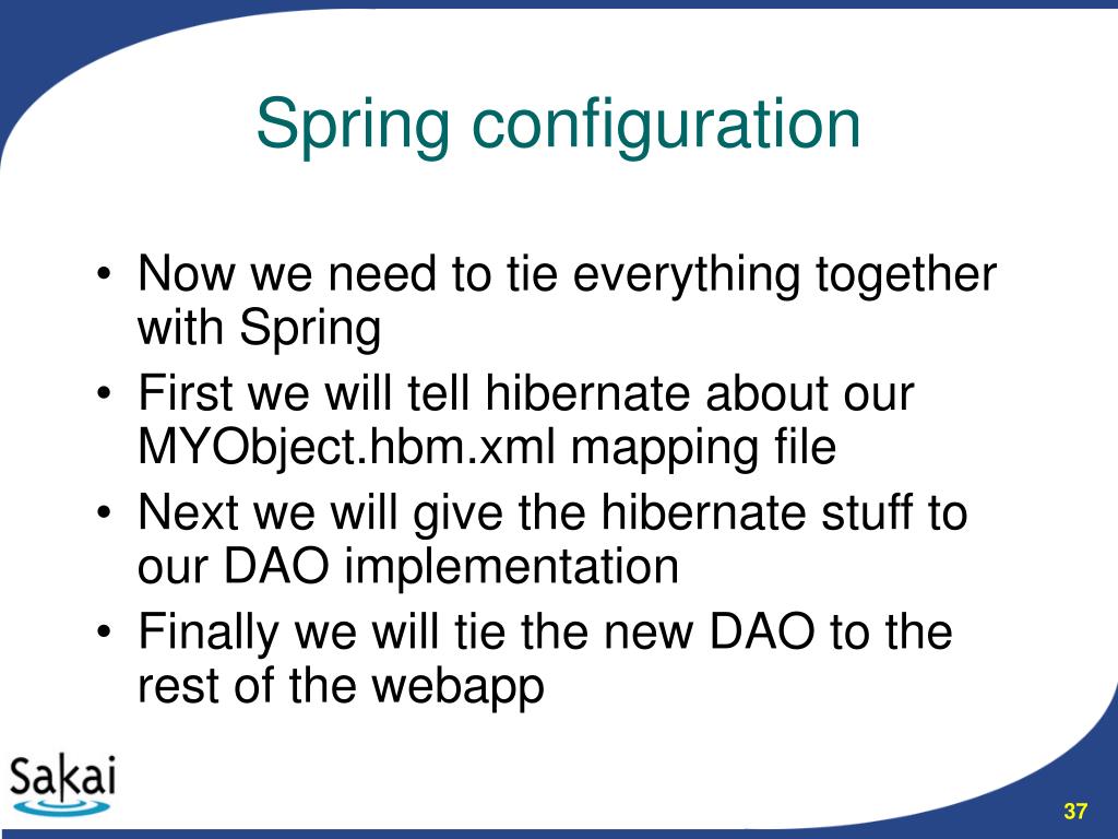 This allows us to use our persistent objects with the Sakai Global SessionFactory Adding our HBMs to the Sakai Global SessionFactory <bean id="org.sakaiproject.yourapp.hibernate. AdditionalHibernateMappings" class="org.sakaiproject.springframework.orm.hibernate. impl.AdditionalHibernateMappingsImpl"> <property name="mappingResources"> <list> <value> org/sakaiproject/yourapp/impl/hbm/Item1.hbm.xml </value> </list> </property> </bean>