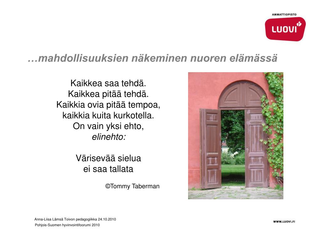 …mahdollisuuksien näkeminen nuoren elämässä Kaikkea saa tehdä. Kaikkea pitää tehdä. Kaikkia ovia pitää tempoa, kaikkia kuita kurkotella. On vain yksi ehto, elinehto: Värisevää sielua ei saa tallata • Tommy Taberman Pohjois-Suomen hyvinvointifoorumi 2010