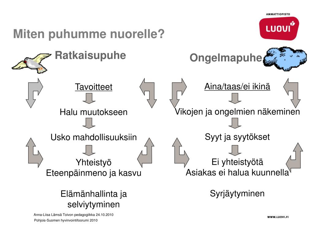 Miten puhumme nuorelle? Ratkaisupuhe Ongelmapuhe Aina/taas/ei ikinä Vikojen ja ongelmien näkeminen Syyt ja syytökset Ei yhteistyötä Asiakas ei halua kuunnella Syrjäytyminen Tavoitteet Halu muutokseen Usko mahdollisuuksiin Yhteistyö Eteenpäinmeno ja kasvu Elämänhallinta ja selviytyminen Pohjois-Suomen hyvinvointifoorumi 2010