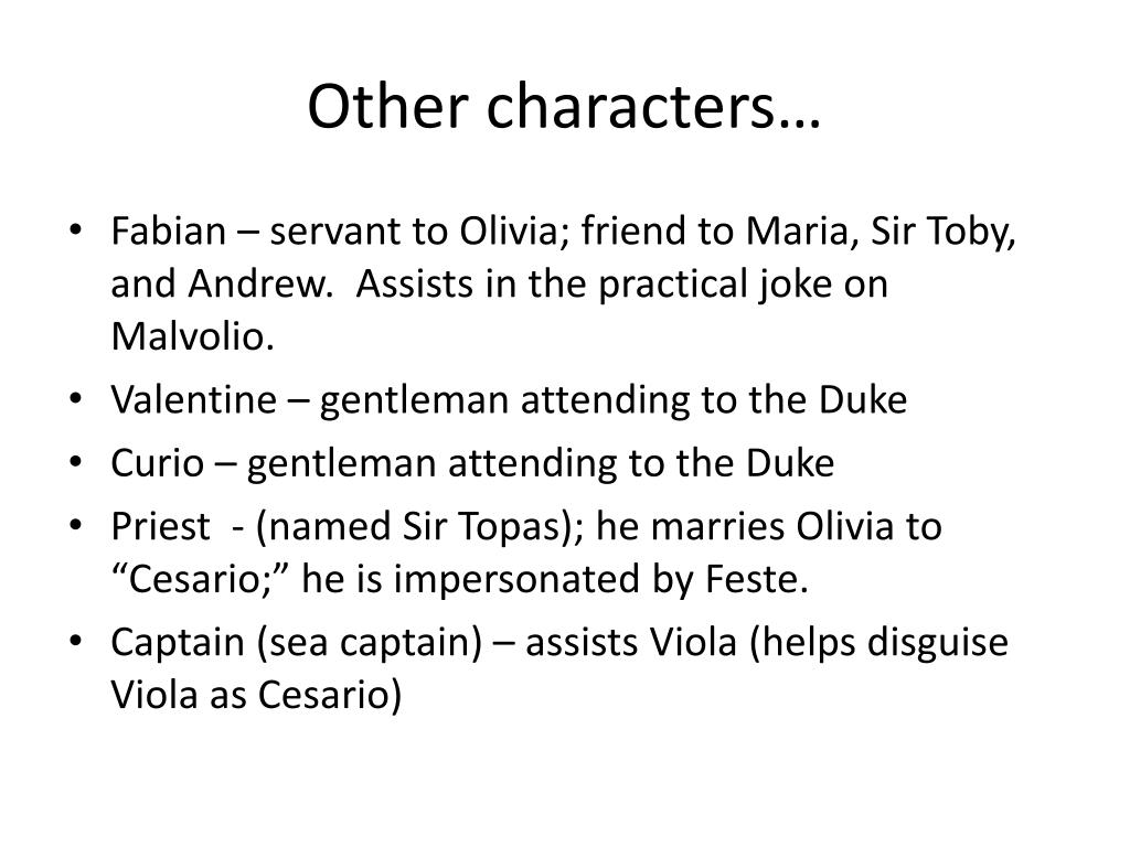 Other characters… • Fabian – servant to Olivia; friend to Maria, Sir Toby, and Andrew. Assists in the practical joke on Malvolio. • Valentine – gentleman attending to the Duke • Curio – gentleman attending to the Duke • Priest - (named Sir Topas); he marries Olivia to “Cesario;” he is impersonated by Feste. • Captain (sea captain) – assists Viola (helps disguise Viola as Cesario)