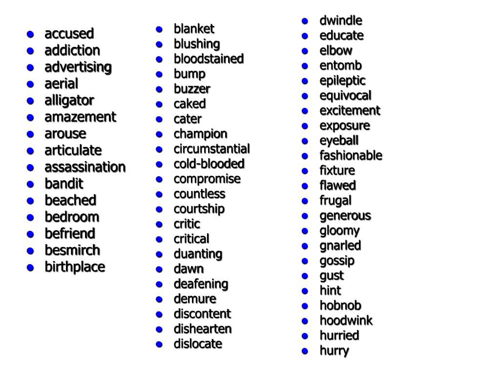 dwindle • educate • elbow • entomb • epileptic • equivocal • excitement • exposure • eyeball • fashionable • fixture • flawed • frugal • generous • gloomy • gnarled • gossip • gust • hint • hobnob • hoodwink • hurried • hurry • blanket • blushing • bloodstained • bump • buzzer • caked • cater • champion • circumstantial • cold-blooded • compromise • countless • courtship • critic • critical • duanting • dawn • deafening • demure • discontent • dishearten • dislocate • accused • addiction • advertising • aerial • alligator • amazement • arouse • articulate • assassination • bandit • beached • bedroom • befriend • besmirch • birthplace
