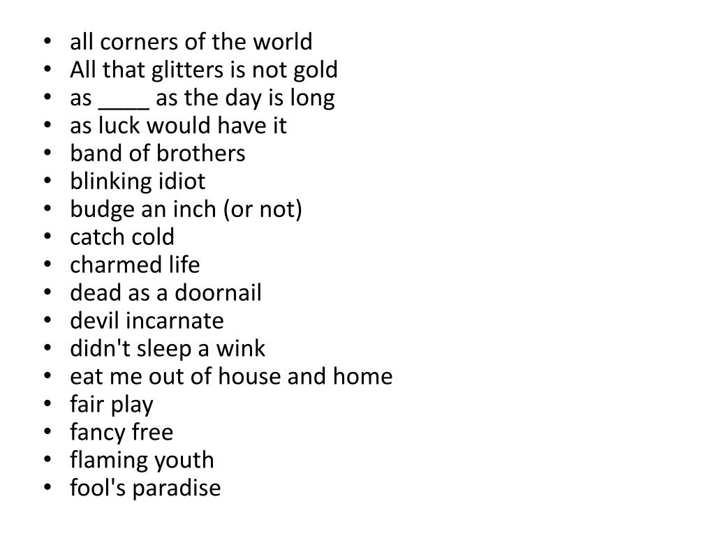 all corners of the world • All that glitters is not gold • as ____ as the day is long • as luck would have it • band of brothers • blinking idiot • budge an inch (or not) • catch cold • charmed life • dead as a doornail • devil incarnate • didn't sleep a wink • eat me out of house and home • fair play • fancy free • flaming youth • fool's paradise