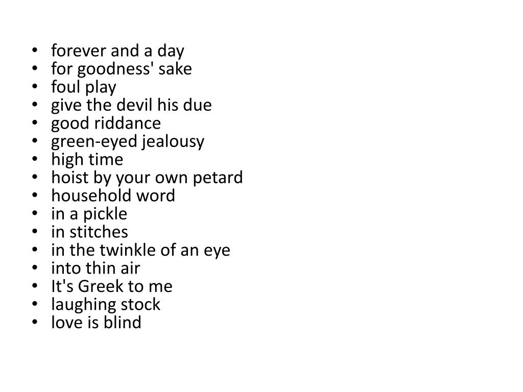 forever and a day • for goodness' sake • foul play • give the devil his due • good riddance • green-eyed jealousy • high time • hoist by your own petard • household word • in a pickle • in stitches • in the twinkle of an eye • into thin air • It's Greek to me • laughing stock • love is blind