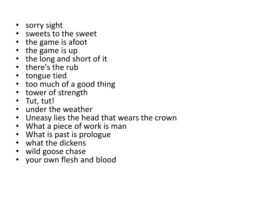 sorry sight • sweets to the sweet • the game is afoot • the game is up • the long and short of it • there's the rub • tongue tied • too much of a good thing • tower of strength • Tut, tut! • under the weather • Uneasy lies the head that wears the crown • What a piece of work is man • What is past is prologue • what the dickens • wild goose chase • your own flesh and blood
