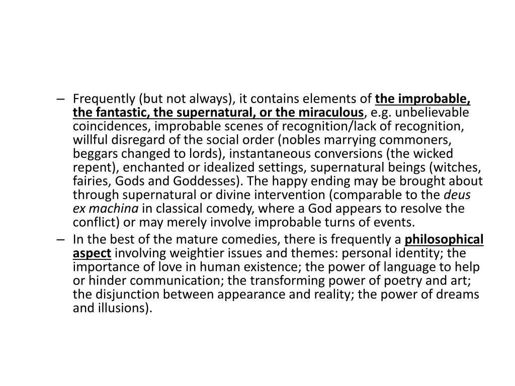 Frequently (but not always), it contains elements of the improbable, the fantastic, the supernatural, or the miraculous, e.g. unbelievable coincidences, improbable scenes of recognition/lack of recognition, willful disregard of the social order (nobles marrying commoners, beggars changed to lords), instantaneous conversions (the wicked repent), enchanted or idealized settings, supernatural beings (witches, fairies, Gods and Goddesses). The happy ending may be brought about through supernatural or divine intervention (comparable to the deus ex machina in classical comedy, where a God appears to resolve the conflict) or may merely involve improbable turns of events. • In the best of the mature comedies, there is frequently a philosophical aspect involving weightier issues and themes: personal identity; the importance of love in human existence; the power of language to help or hinder communication; the transforming power of poetry and art; the disjunction between appearance and reality; the power of dreams and illusions).