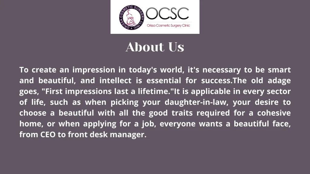 About Us To create an impression in today's world, it's necessary to be smart and beautiful, and intellect is essential for success.The old adage goes, "First impressions last a lifetime."It is applicable in every sector of life, such as when picking your daughter-in-law, your desire to choose a beautiful with all the good traits required for a cohesive home, or when applying for a job, everyone wants a beautiful face, from CEO to front desk manager.