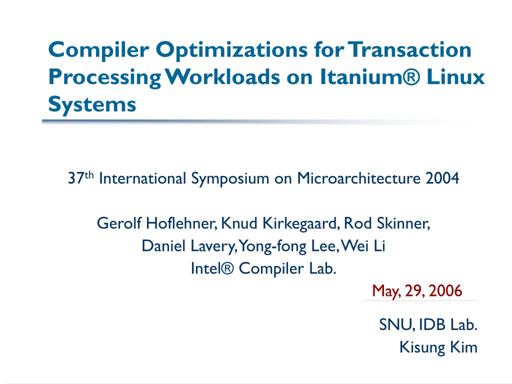 Compiler Optimizations for Transaction Processing Workloads on Itanium® Linux Systems 37th International Symposium on Microarchitecture 2004 Gerolf Hoflehner, Knud Kirkegaard, Rod Skinner, Daniel Lavery, Yong-fong Lee, Wei Li Intel® Compiler Lab. May, 29, 2006 SNU, IDB Lab. Kisung Kim