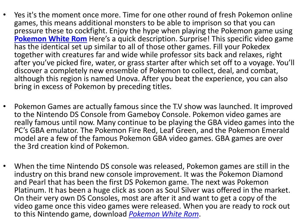 Yes it's the moment once more. Time for one other round of fresh Pokemon online games, this means additional monsters to be able to imprison so that you can pressure these to cockfight. Enjoy the hype when playing the Pokemon game using Pokemon White Rom Here’s a quick description. Surprise! This specific video game has the identical set up similar to all of those other games. Fill your Pokedex together with creatures far and wide while professor sits back and relaxes, right after you’ve picked fire, water, or grass starter after which set off to a voyage. You’ll discover a completely new ensemble of Pokemon to collect, deal, and combat, although this region is named Unova. After you beat the experience, you can also bring in excess of Pokemon by preceding titles. • Pokemon Games are actually famous since the T.V show was launched. It improved to the Nintendo DS Console from Gameboy Console. Pokemon video games are really famous until now. Many continue to be playing the GBA video games into the PC’s GBA emulator. The Pokemon Fire Red, Leaf Green, and the Pokemon Emerald model are a few of the famous Pokemon GBA video games. GBA games are over the 3rd creation kind of Pokemon. • When the time Nintendo DS console was released, Pokemon games are still in the industry on this brand new console improvement. It was the Pokemon Diamond and Pearl that has been the first DS Pokemon game. The next was Pokemon Platinum. It has been a huge click as soon as Soul Silver was offered in the market. On their very own DS Consoles, most are after it and want to get a copy of the video game once this video games were released. When you are ready to rock out to this Nintendo game, download Pokemon White Rom.