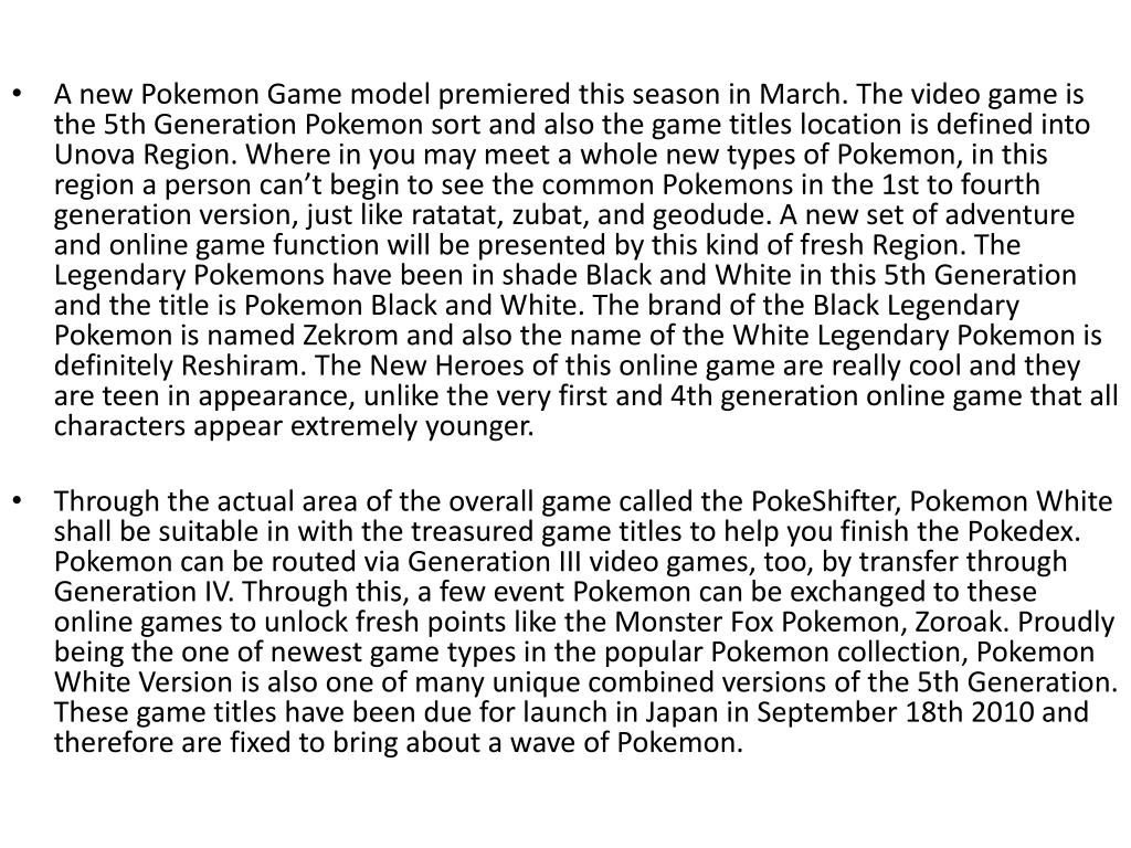 A new Pokemon Game model premiered this season in March. The video game is the 5th Generation Pokemon sort and also the game titles location is defined into Unova Region. Where in you may meet a whole new types of Pokemon, in this region a person can’t begin to see the common Pokemons in the 1st to fourth generation version, just like ratatat, zubat, and geodude. A new set of adventure and online game function will be presented by this kind of fresh Region. The Legendary Pokemons have been in shade Black and White in this 5th Generation and the title is Pokemon Black and White. The brand of the Black Legendary Pokemon is named Zekrom and also the name of the White Legendary Pokemon is definitely Reshiram. The New Heroes of this online game are really cool and they are teen in appearance, unlike the very first and 4th generation online game that all characters appear extremely younger. • Through the actual area of the overall game called the PokeShifter, Pokemon White shall be suitable in with the treasured game titles to help you finish the Pokedex. Pokemon can be routed via Generation III video games, too, by transfer through Generation IV. Through this, a few event Pokemon can be exchanged to these online games to unlock fresh points like the Monster Fox Pokemon, Zoroak. Proudly being the one of newest game types in the popular Pokemon collection, Pokemon White Version is also one of many unique combined versions of the 5th Generation. These game titles have been due for launch in Japan in September 18th 2010 and therefore are fixed to bring about a wave of Pokemon.