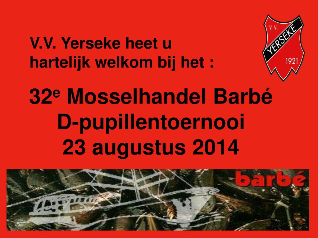V.V. Yerseke heet u hartelijk welkom bij het : 32eMosselhandel Barbé D-pupillentoernooi23 augustus 2014