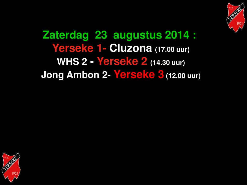 Zaterdag 23 augustus 2014 : Yerseke 1- Cluzona(17.00 uur) WHS 2 - Yerseke 2 (14.30 uur) Jong Ambon 2- Yerseke 3 (12.00 uur)