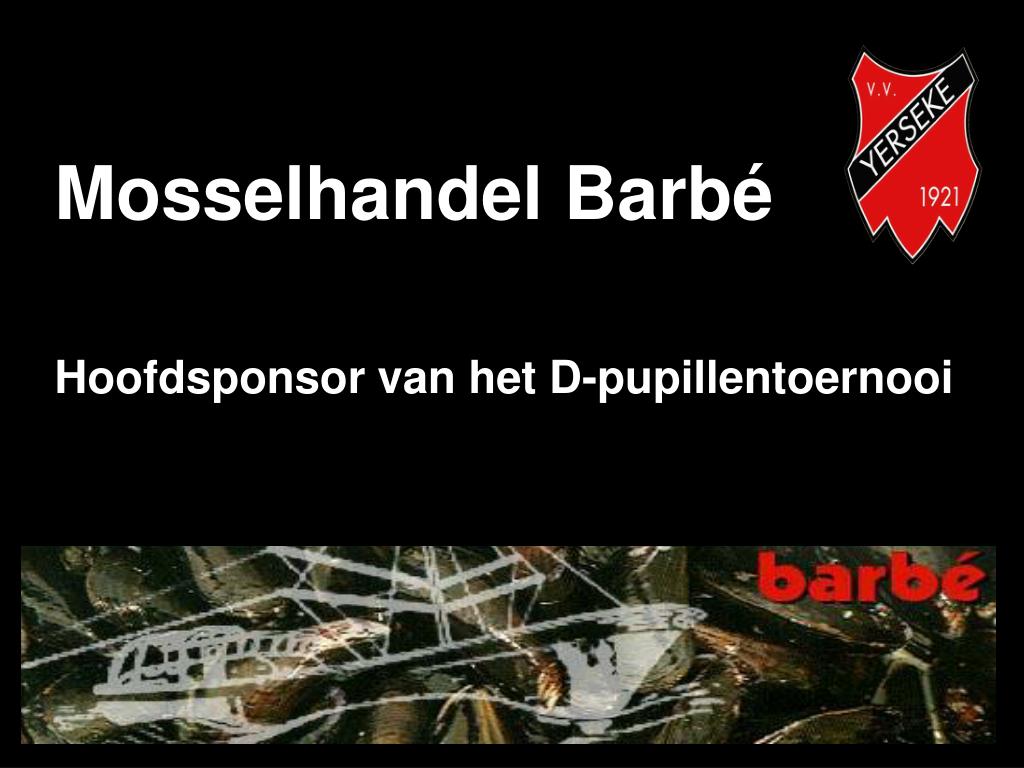 V.V. Yerseke heet u hartelijk welkom bij het :. 32 e Mosselhandel Barbé D-pupillentoernooi 23 augustus 2014. Mosselhandel Barbé. Hoofdsponsor van het D-pupillentoernooi. Deelnemende verenigingen (+ kleedkamer). 32 e Mosselhandel Barb é D-pupillentoernooi. Balsponsoren.