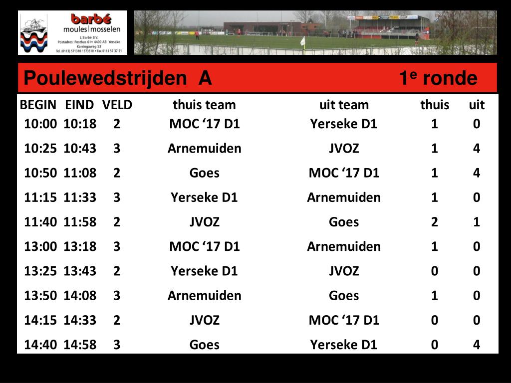 Deelnemende verenigingen (+ kleedkamer) 32eMosselhandel Barbé D-pupillentoernooi