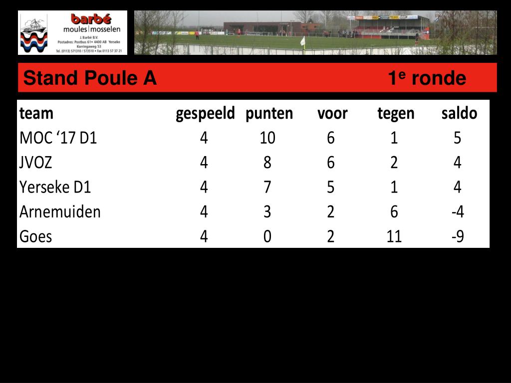 Stand Poule B 1eronde Zeelandia is niet komen opdagen. Alle ploegen winnen met 3-0 van Zeelandia.