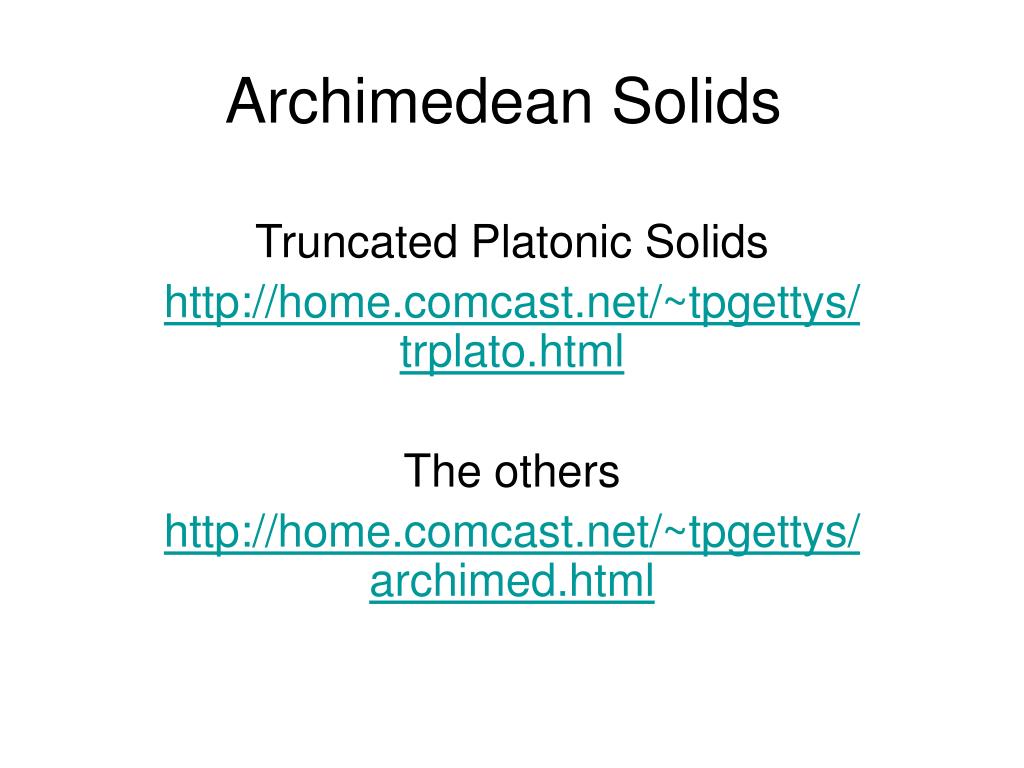 Archimedean Solids Truncated Platonic Solids http://home.comcast.net/~tpgettys/trplato.html The others http://home.comcast.net/~tpgettys/archimed.html