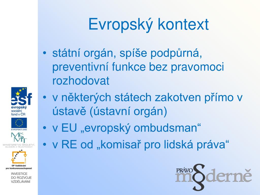 Evropský kontext • státní orgán, spíše podpůrná, preventivní funkce bez pravomoci rozhodovat • v některých státech zakotven přímo v ústavě (ústavní orgán) • v EU „evropský ombudsman“ • v RE od „komisař pro lidská práva“