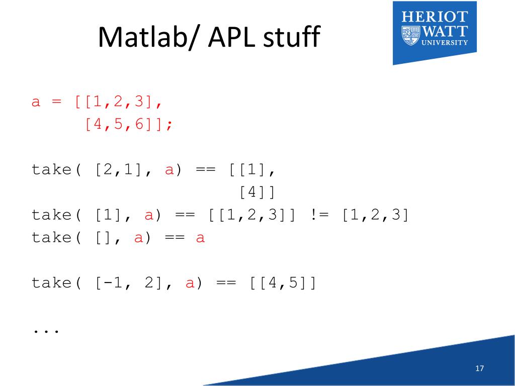 Matlab/ APL stuff a = [[1,2,3], [4,5,6]]; take( [2,1], a) == [[1], [4]] take( [1], a) == [[1,2,3]] != [1,2,3] take( [], a) == a take( [-1, 2], a) == [[4,5]] ...