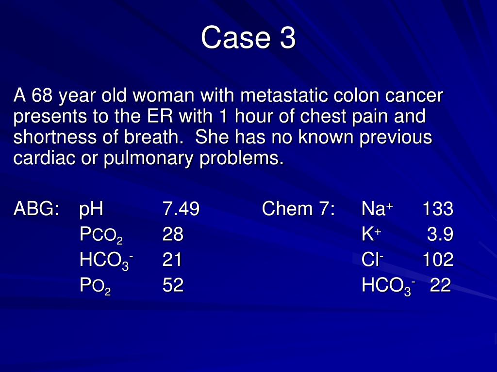 Case 3 A 68 year old woman with metastatic colon cancer presents to the ER with 1 hour of chest pain and shortness of breath. She has no known previous cardiac or pulmonary problems. ABG: pH 7.49 Chem 7: Na+ 133 PCO2 28 K+ 3.9 HCO3- 21 Cl- 102 PO2 52 HCO3- 22