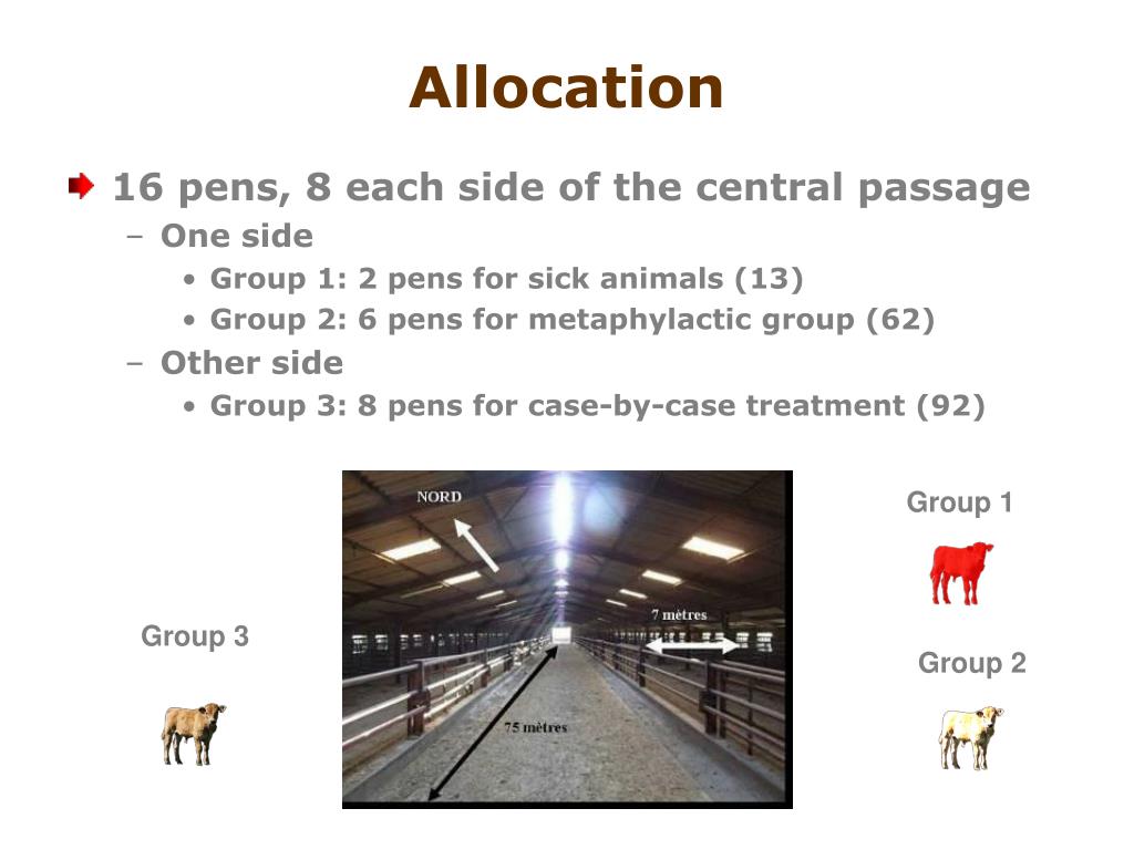 Allocation • 16 pens, 8 each side of the central passage • One side • Group 1: 2 pens for sick animals (13) • Group 2: 6 pens for metaphylactic group (62) • Other side • Group 3: 8 pens for case-by-case treatment (92) Group 1 Group 3 Group 2