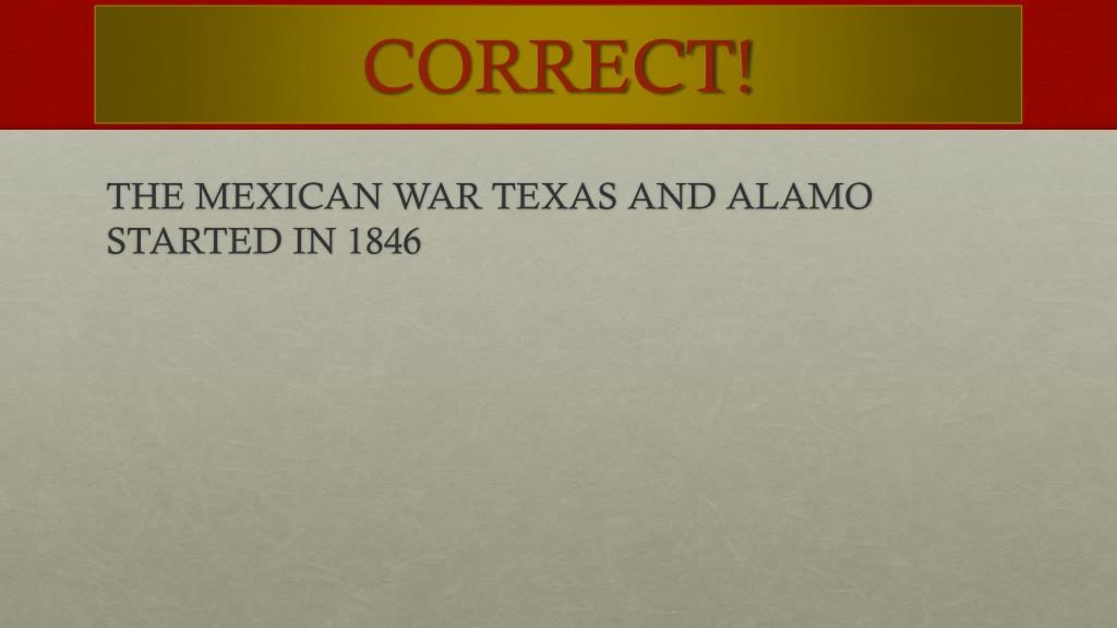 CORRECT! THE MEXICAN WAR TEXAS AND ALAMO STARTED IN 1846