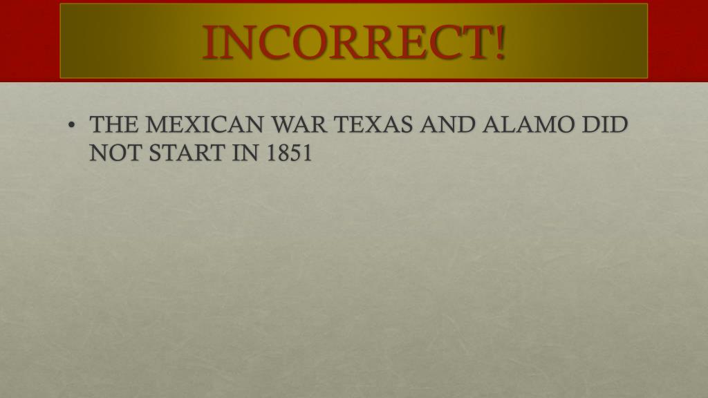 INCORRECT! • THE MEXICAN WAR TEXAS AND ALAMO DID NOT START IN 1851