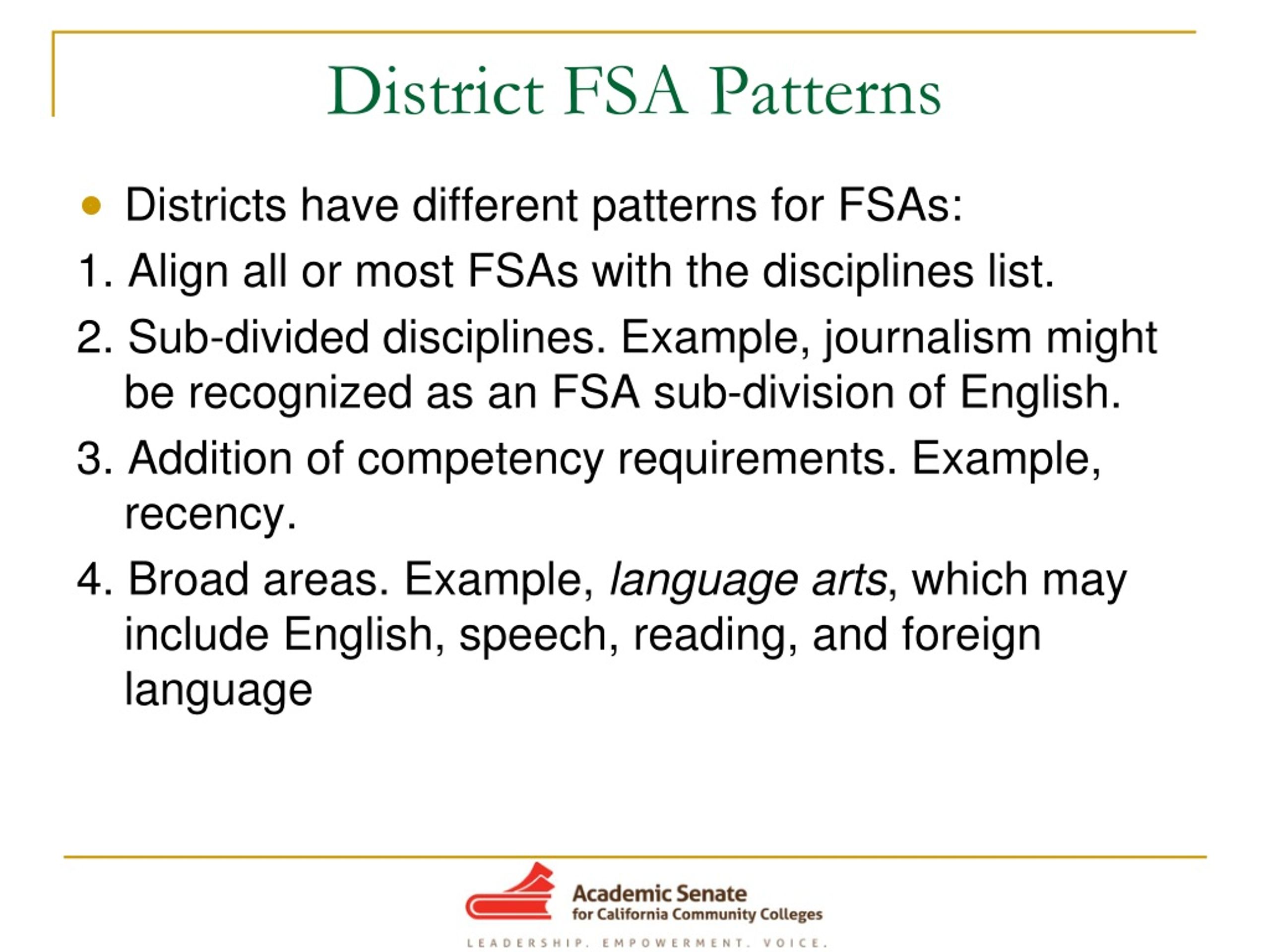 District FSA Patterns Districts have different patterns for FSAs: 1. Align all or most FSAs with the disciplines list. 2. Sub-divided disciplines. Example, journalism might be recognized as an FSA sub-division of English. 3. Addition of competency requirements. Example, recency. 4. Broad areas. Example, language arts, which may include English, speech, reading, and foreign language