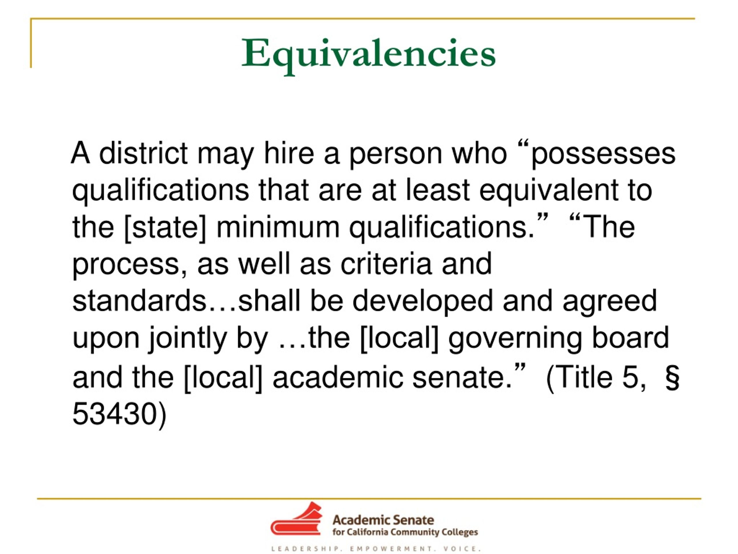 Equivalencies A district may hire a person who “possesses qualifications that are at least equivalent to the [state] minimum qualifications.”“The process, as well as criteria and standards…shall be developed and agreed upon jointly by …the [local] governing board and the [local] academic senate.” (Title 5, § 53430)