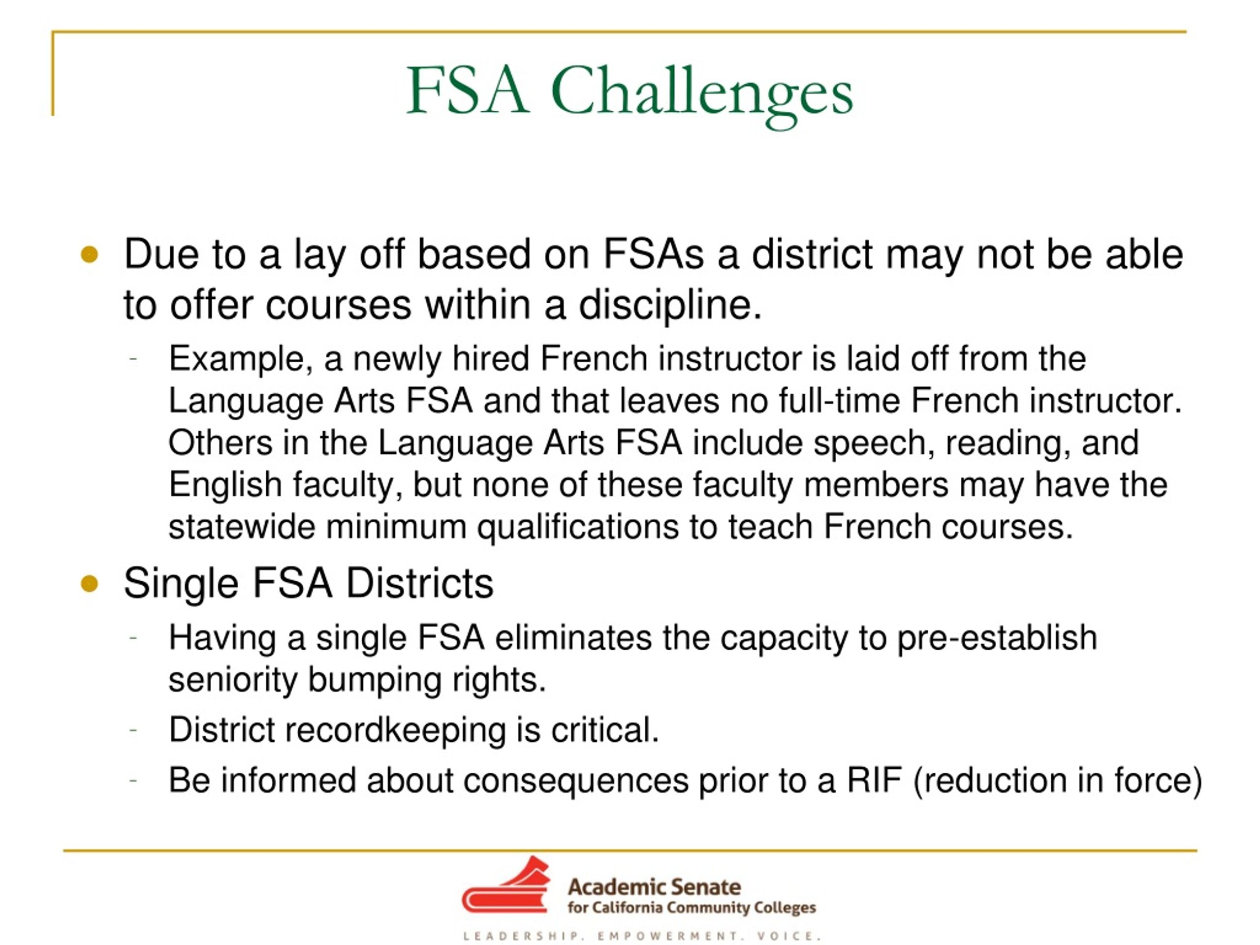 FSA Challenges • Due to a lay off based on FSAs a district may not be able to offer courses within a discipline. • Example, a newly hired French instructor is laid off from the Language Arts FSA and that leaves no full-time French instructor. Others in the Language Arts FSA include speech, reading, and English faculty, but none of these faculty members may have the statewide minimum qualifications to teach French courses. • Single FSA Districts • Having a single FSA eliminates the capacity to pre-establish seniority bumping rights. • District recordkeeping is critical. • Be informed about consequences prior to a RIF (reduction in force)