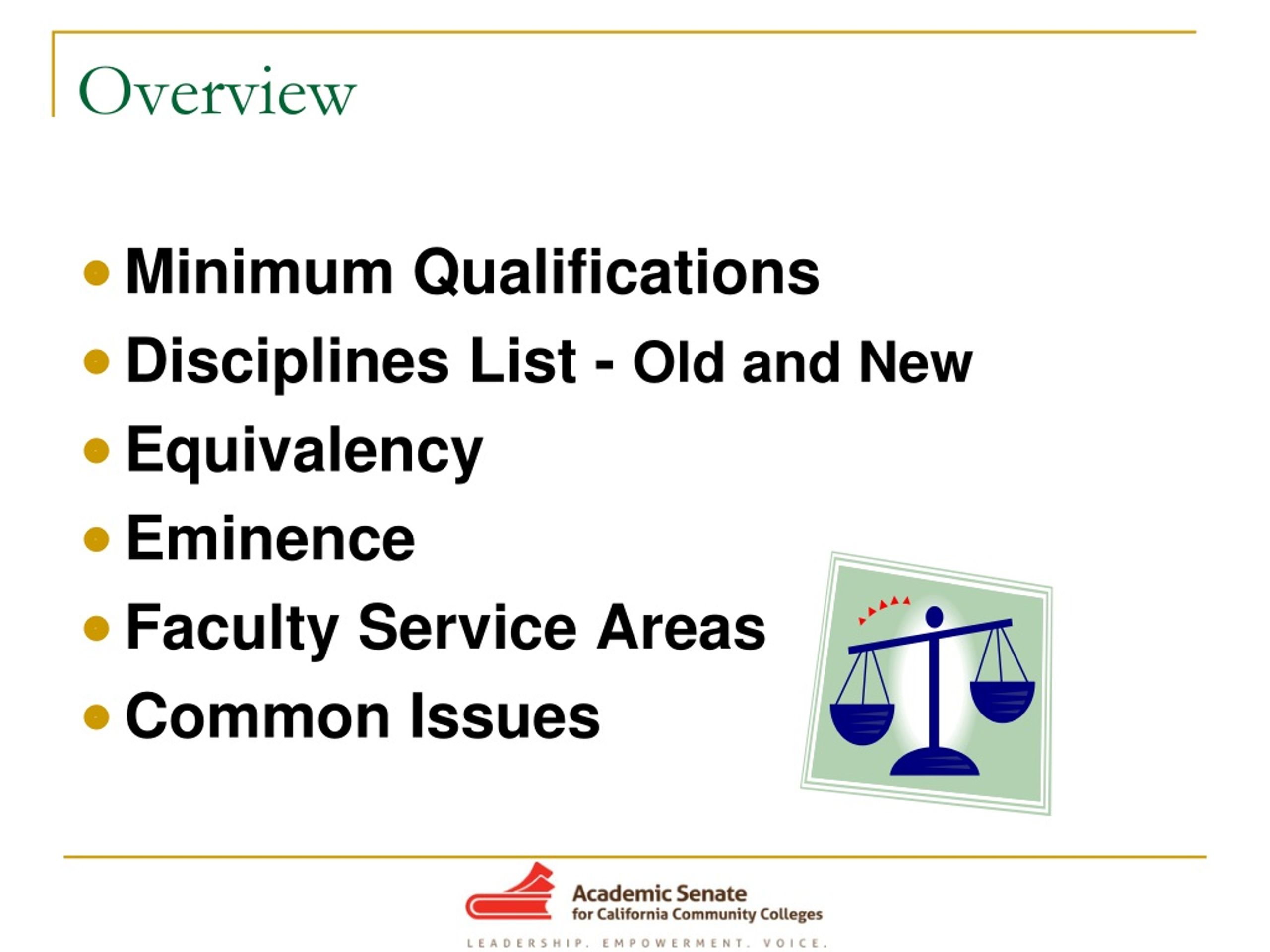 Overview • Minimum Qualifications • Disciplines List - Old and New • Equivalency • Eminence • Faculty Service Areas • Common Issues