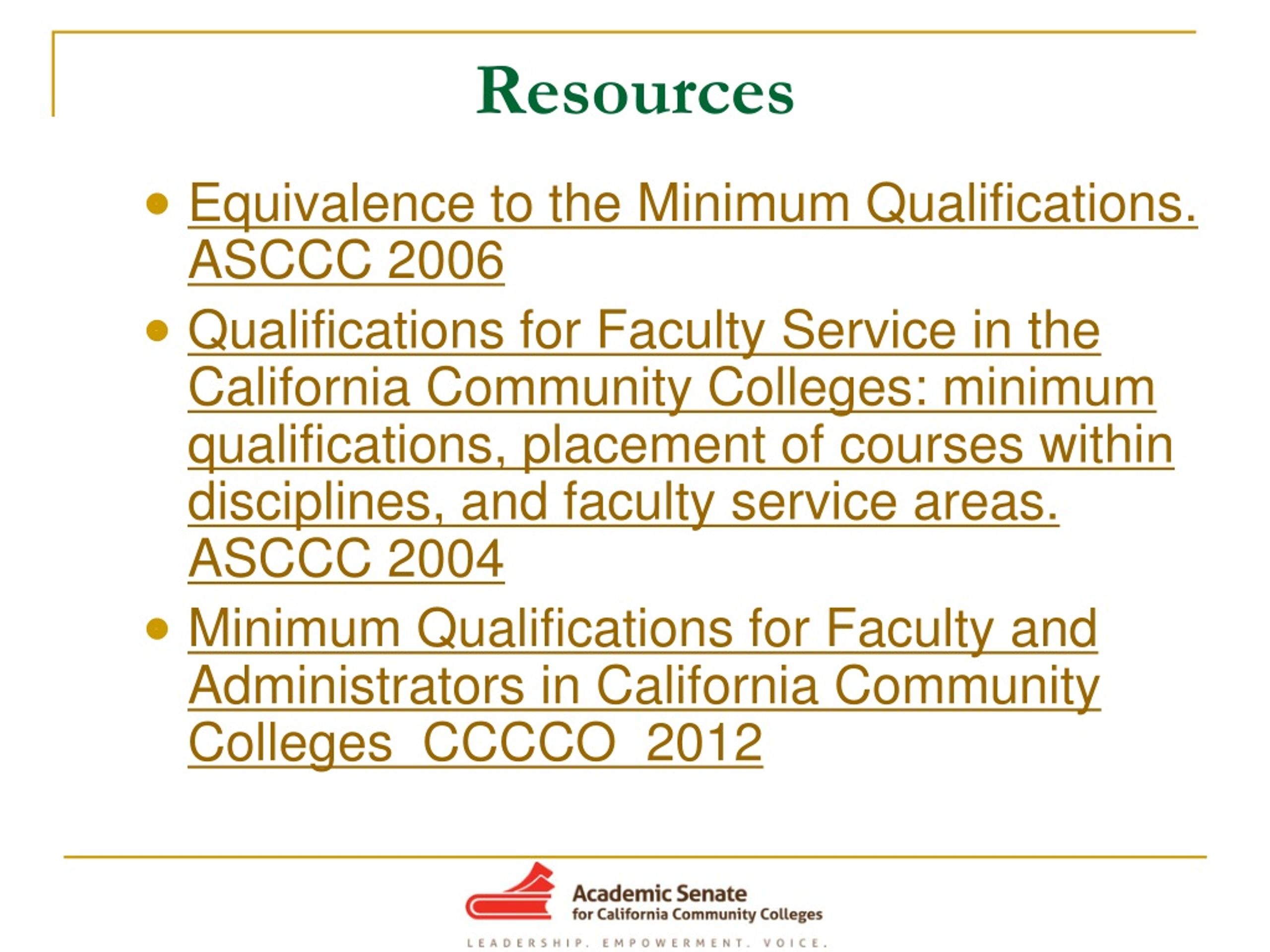 Resources • Equivalence to the Minimum Qualifications. ASCCC 2006 • Qualifications for Faculty Service in the California Community Colleges: minimum qualifications, placement of courses within disciplines, and faculty service areas. ASCCC 2004 • Minimum Qualifications for Faculty and Administrators in California Community Colleges CCCCO 2012