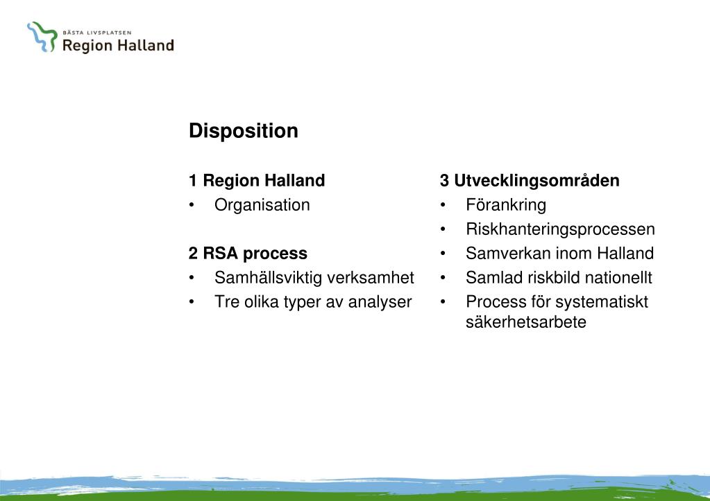 Disposition • 1 Region Halland • Organisation • 2 RSA process • Samhällsviktig verksamhet • Tre olika typer av analyser • 3 Utvecklingsområden • Förankring • Riskhanteringsprocessen • Samverkan inom Halland • Samlad riskbild nationellt • Process för systematiskt säkerhetsarbete