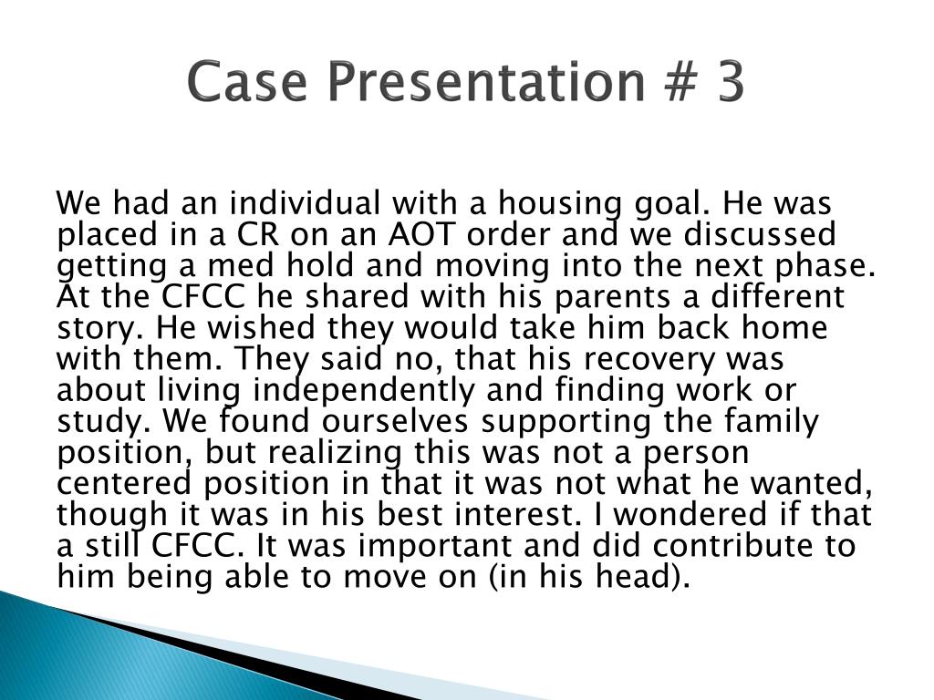Case Presentation # 3 We had an individual with a housing goal. He was placed in a CR on an AOT order and we discussed getting a med hold and moving into the next phase. At the CFCC he shared with his parents a different story. He wished they would take him back home with them. They said no, that his recovery was about living independently and finding work or study. We found ourselves supporting the family position, but realizing this was not a person centered position in that it was not what he wanted, though it was in his best interest. I wondered if that a still CFCC. It was important and did contribute to him being able to move on (in his head).