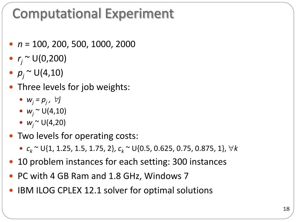 Computational Experiment • n = 100, 200, 500, 1000, 2000 • rj ~ U(0,200) • pj~ U(4,10) • Three levels for job weights: • wj = pj , j • wj~ U(4,10) • wj~ U(4,20) • Two levels for operating costs: • ck~ U{1, 1.25, 1.5, 1.75, 2}, ck ~ U{0.5, 0.625, 0.75, 0.875, 1}, k • 10 problem instances for each setting: 300 instances • PC with 4 GB Ram and 1.8 GHz, Windows 7 • IBM ILOG CPLEX 12.1 solver for optimal solutions