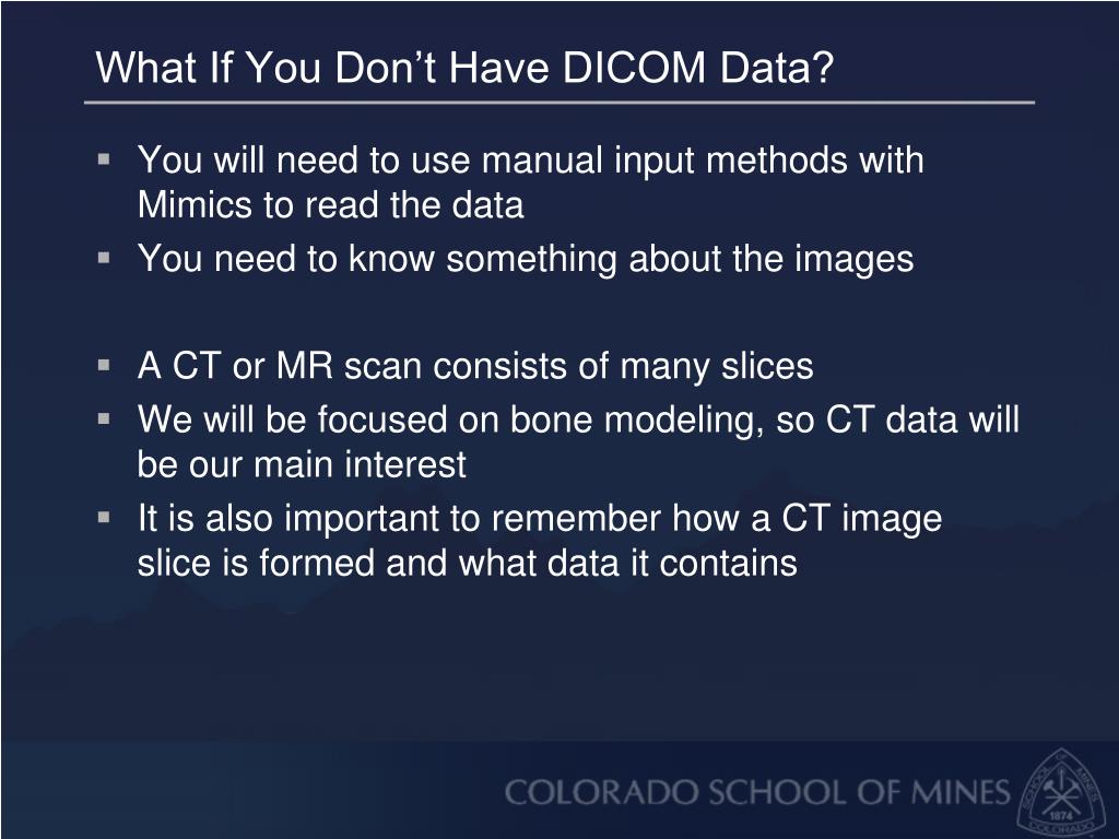 What If You Don’t Have DICOM Data? • You will need to use manual input methods with Mimics to read the data • You need to know something about the images • A CT or MR scan consists of many slices • We will be focused on bone modeling, so CT data will be our main interest • It is also important to remember how a CT image slice is formed and what data it contains