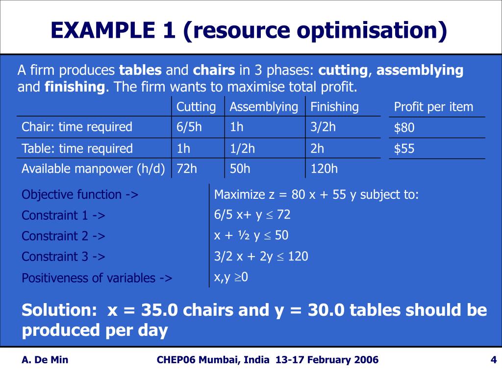 EXAMPLE 1 (resource optimisation) • A firm produces tables and chairs in 3 phases: cutting, assemblying and finishing. The firm wants to maximise total profit. Solution: x = 35.0 chairs and y = 30.0 tables should be produced per day CHEP06 Mumbai, India 13-17 February 2006