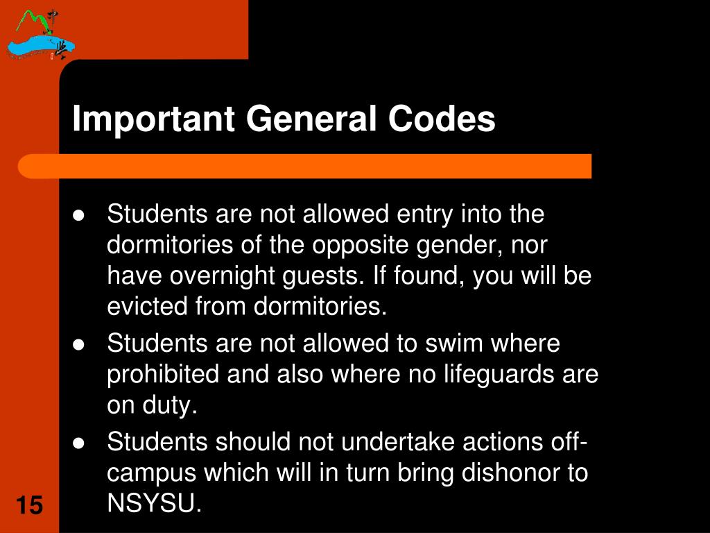 Important General Codes • Students are not allowed entry into the dormitories of the opposite gender, nor have overnight guests. If found, you will be evicted from dormitories. • Students are not allowed to swim where prohibited and also where no lifeguards are on duty. • Students should not undertake actions off-campus which will in turn bring dishonor to NSYSU.