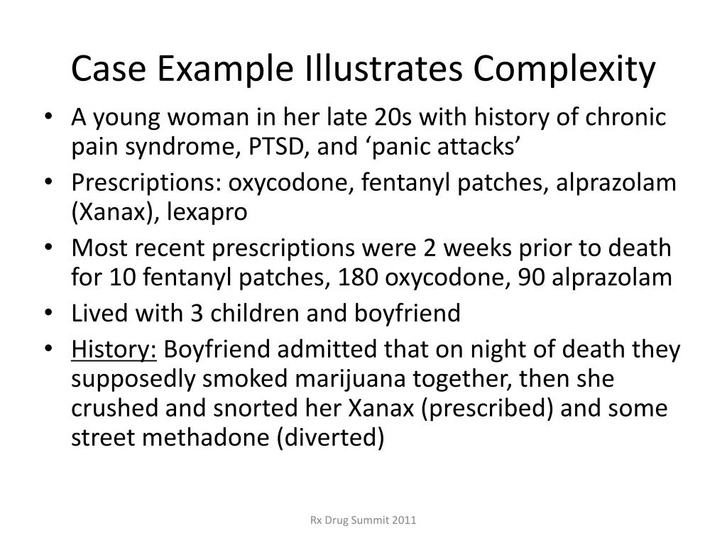 Case Example Illustrates Complexity • A young woman in her late 20s with history of chronic pain syndrome, PTSD, and ‘panic attacks’ • Prescriptions: oxycodone, fentanyl patches, alprazolam (Xanax), lexapro • Most recent prescriptions were 2 weeks prior to death for 10 fentanyl patches, 180 oxycodone, 90 alprazolam • Lived with 3 children and boyfriend • History: Boyfriend admitted that on night of death they supposedly smoked marijuana together, then she crushed and snorted her Xanax (prescribed) and some street methadone (diverted) Rx Drug Summit 2011