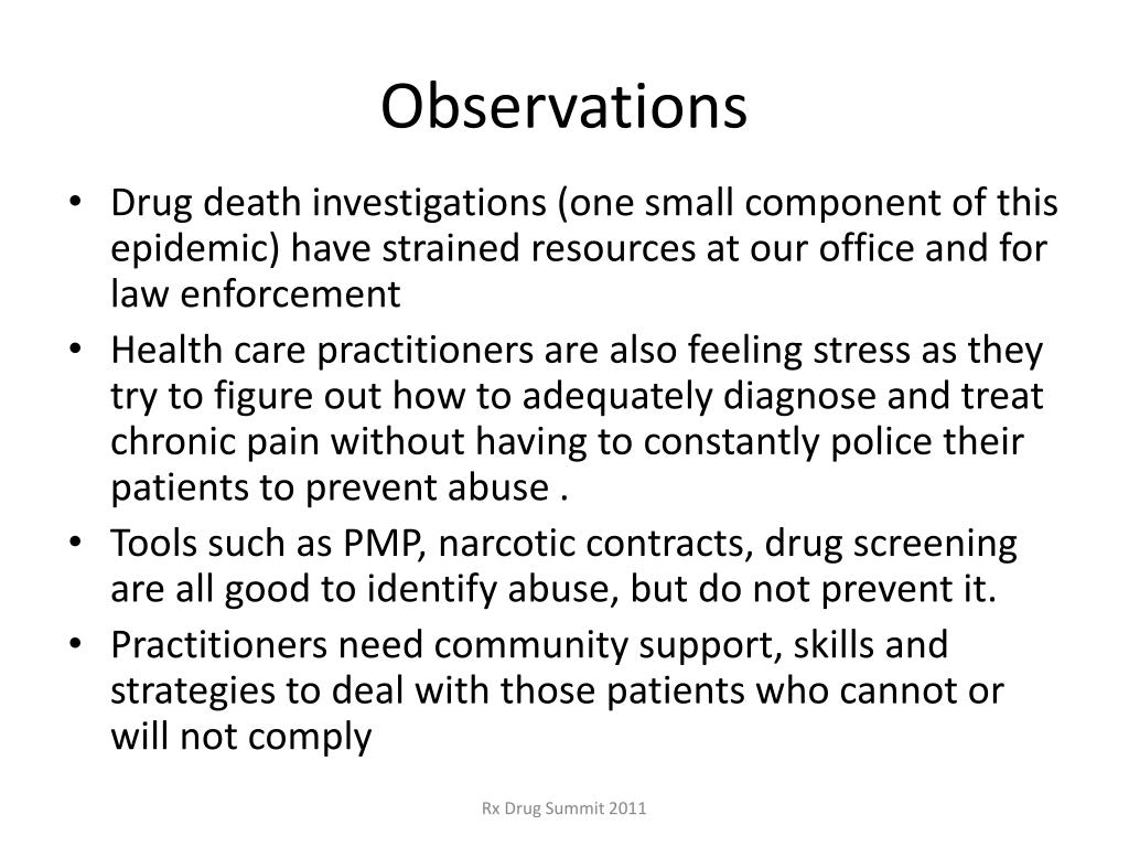 Observations • Drug death investigations (one small component of this epidemic) have strained resources at our office and for law enforcement • Health care practitioners are also feeling stress as they try to figure out how to adequately diagnose and treat chronic pain without having to constantly police their patients to prevent abuse . • Tools such as PMP, narcotic contracts, drug screening are all good to identify abuse, but do not prevent it. • Practitioners need community support, skills and strategies to deal with those patients who cannot or will not comply Rx Drug Summit 2011