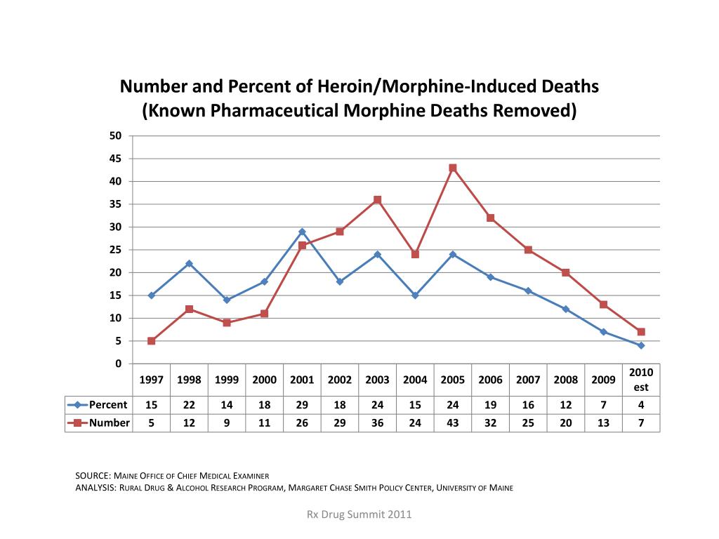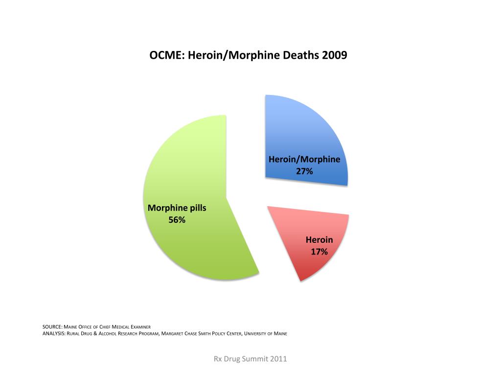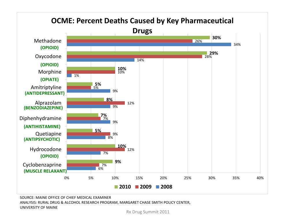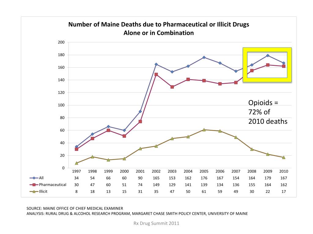 Opioids = 72% of 2010 deaths SOURCE: MAINE OFFICE OF CHIEF MEDICAL EXAMINER ANALYSIS: RURAL DRUG & ALCOHOL RESEARCH PROGRAM, MARGARET CHASE SMITH POLICY CENTER, UNIVERSITY OF MAINE Rx Drug Summit 2011