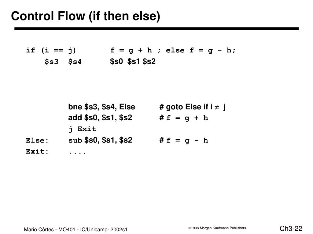 Control Flow (if then else) if (i == j) f = g + h ; else f = g - h; $s3 $s4 $s0 $s1 $s2 bne $s3, $s4, Else # goto Else if i j add $s0, $s1, $s2 # f = g + h j Exit Else: sub $s0, $s1, $s2 # f = g - h Exit: ....
