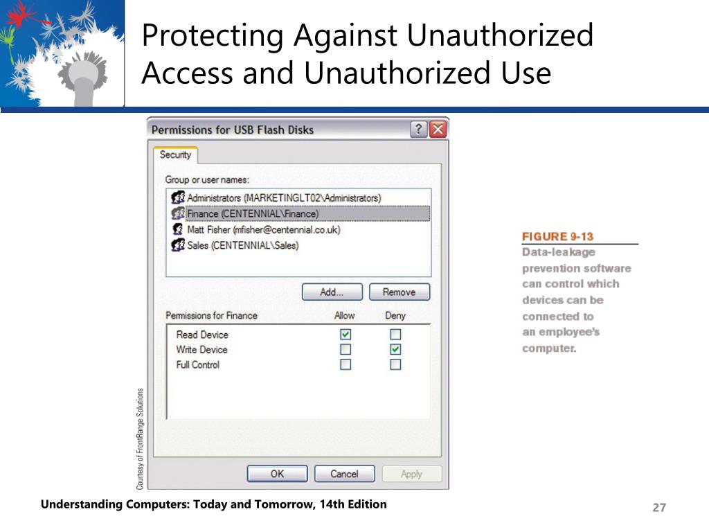 Protecting Against Unauthorized Access and Unauthorized Use • Sensible Employee Precautions • Screen Potential New Hires Carefully • Watch for Disgruntled Employees and Ex-Employees • Develop Policies and Controls • Use Data-Leakage Prevention and Enterprise Rights-Management Software • Ask Business Partners to Review Their Security Understanding Computers: Today and Tomorrow, 14th Edition