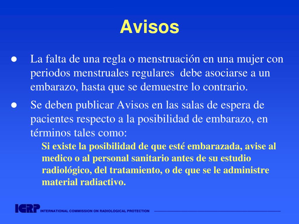 Avisos • La falta de una regla o menstruación en una mujer con periodos menstruales regulares debe asociarse a un embarazo, hasta que se demuestre lo contrario. • Se deben publicar Avisos en las salas de espera de pacientes respecto a la posibilidad de embarazo, en términos tales como: Si existe la posibilidad de que esté embarazada, avise al medico o al personal sanitario antes de su estudio radiológico, del tratamiento, o de que se le administre material radiactivo. INTERNATIONAL COMMISSION ON RADIOLOGICAL PROTECTION ——————————————————————————————————————